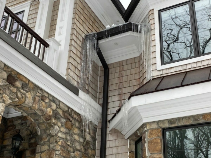Ice dams, icicles, and snow loads may look nice, but they can cause significant problems for your roof, and the rest of your home. This beautiful, yet complex roof had ice dams and snow cover which were not melting properly due to the architecture of the roof and the minimal 3ft underlayment installed by a previous contractor. Novalis’ standard underlayment is 6 ft.